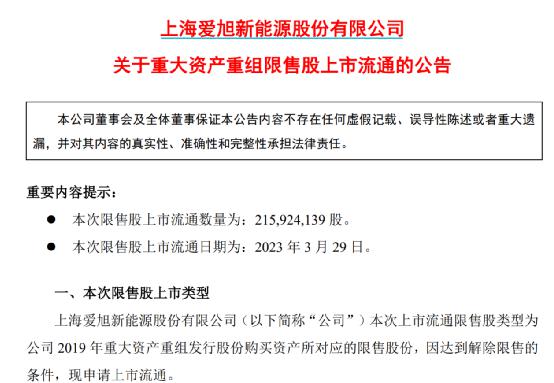 電池片龍頭愛旭股份(600732)(600732)將在3月29日解禁2.16億股限售股,這部分股票為公司實控人陳剛及其一致行動人自2019年的重組而持有。在禁售期內,愛旭股份經歷了業(yè)績不達標、股東業(yè)績補償?shù)取安迩?,最終這部分股份在三年半后得以解鎖。