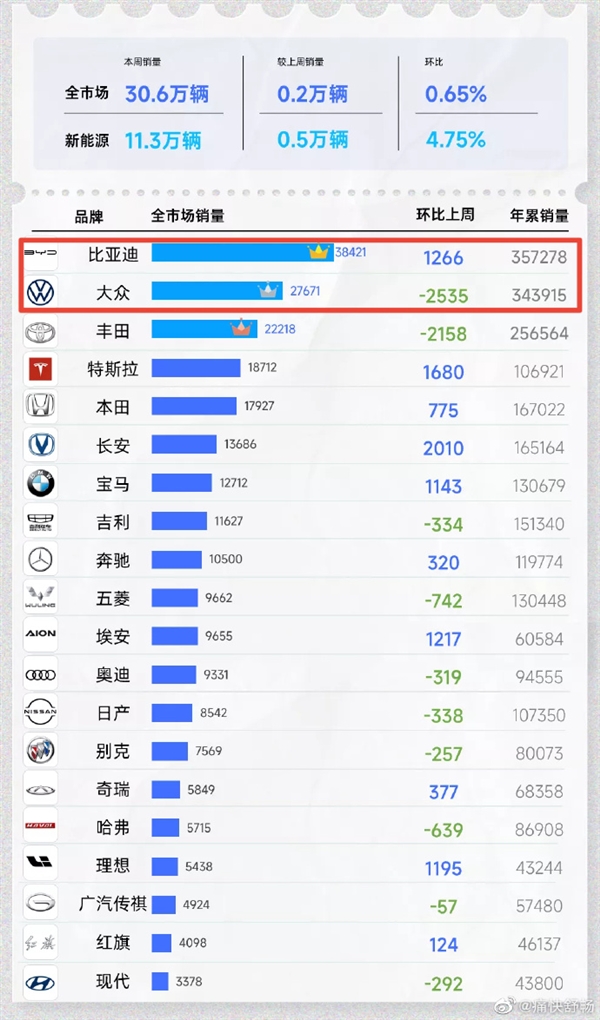 具體數據方面,本周,比亞迪2023年累計銷量357278輛,超越大眾(一汽大眾+上汽大眾)的343915輛。豐田以256564輛位居第三。