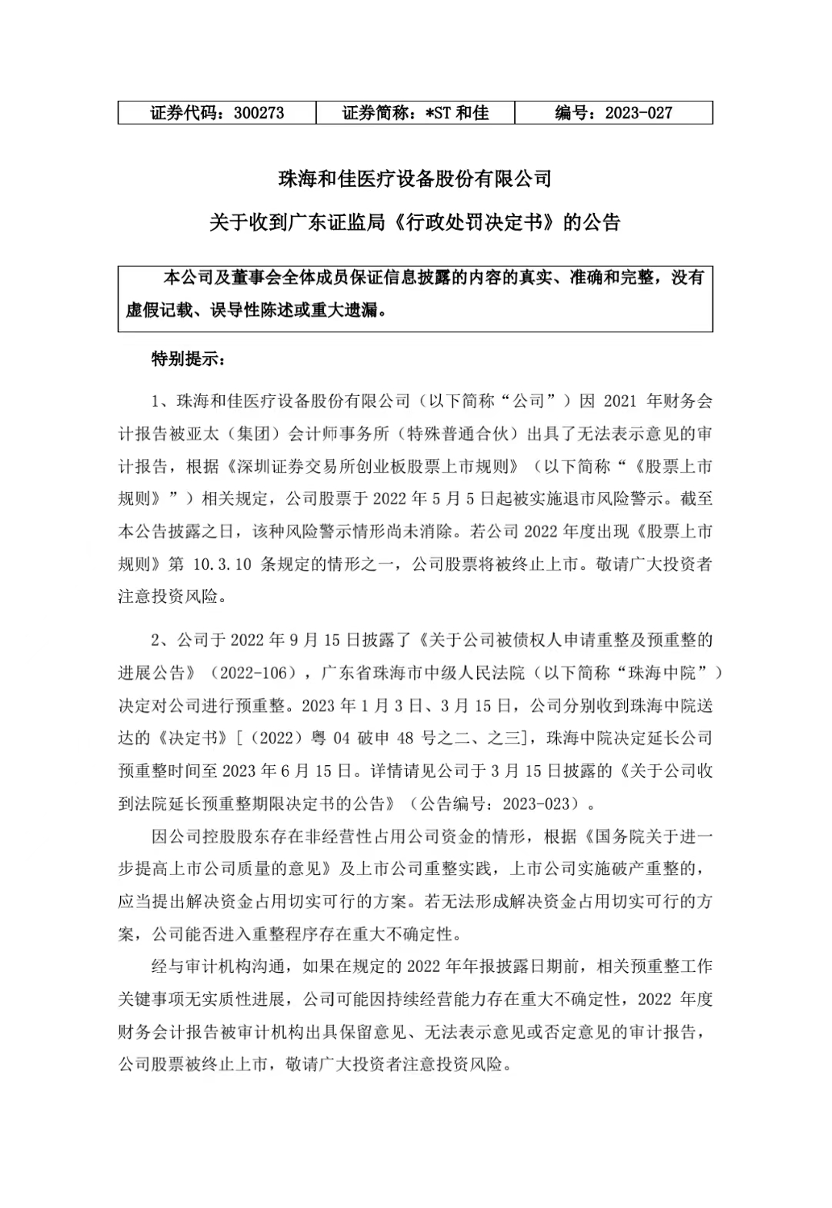 根據(jù)公告,因涉嫌信息披露違法違規(guī),*ST和佳于2022年12月7日收到中國證監(jiān)會(huì)立案告知書。3月28日,公司收到廣東證監(jiān)局送達(dá)的《行政處罰決定書》。