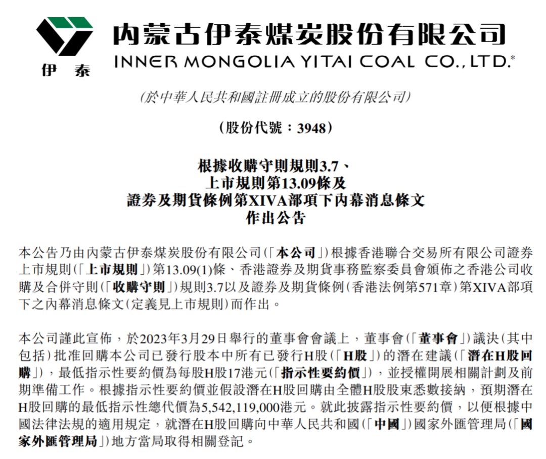 伊泰煤炭發(fā)布公告,于2023年3月29日舉行的董事會(huì)會(huì)議上,董事會(huì)議決批準(zhǔn)回購(gòu)公司已發(fā)行股本中所有已發(fā)行H股的潛在建議(潛在H股回購(gòu)),最低指示性要約價(jià)為每股H股17港元(指示性要約價(jià)),并授權(quán)開(kāi)展相關(guān)計(jì)劃及前期準(zhǔn)備工作。根據(jù)指示性要約價(jià)并假設(shè)潛在H股回購(gòu)由全體H股股東悉數(shù)接納,預(yù)期潛在H股回購(gòu)的最低指示性總代價(jià)為55.42億港元。就此披露指示性要約價(jià),以便根據(jù)中國(guó)法律法規(guī)的適用規(guī)定,就潛在H股回購(gòu)向中國(guó)國(guó)家外匯管理局地方當(dāng)局取得相關(guān)登記。