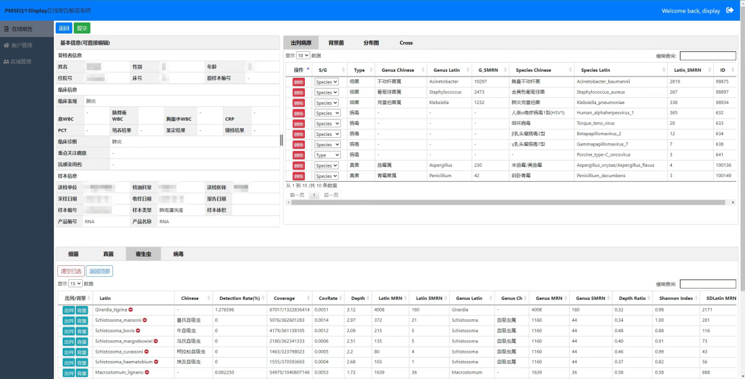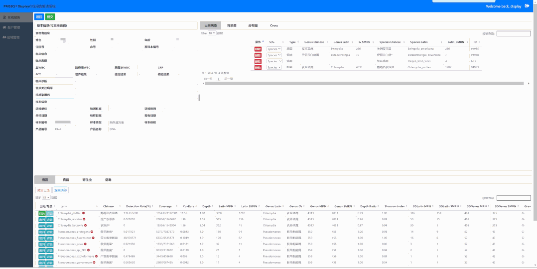 PM Display智能報(bào)告系統(tǒng)是配套PMseq 病原微生物高通量測序產(chǎn)品的組學(xué)大數(shù)據(jù)分析系統(tǒng),實(shí)現(xiàn)對PMseq 病原檢測后的檢測結(jié)果歸集、存儲(chǔ)、統(tǒng)計(jì)、分析、數(shù)據(jù)挖掘。使用可視化操作界面,人工確定檢出病原為最終臨床報(bào)告。該系統(tǒng)帶自我學(xué)習(xí)功能,在使用過程中不斷結(jié)合用戶給出的結(jié)果優(yōu)化默認(rèn)推薦病原,并能結(jié)合PM Online給出不同病原的檢出分布。