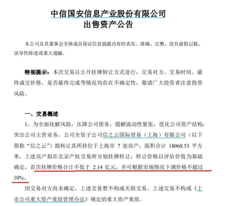 根據(jù)ST國安4月3日發(fā)布的公告,為全面化解風(fēng)險,壓降公司債務(wù),緩解流動性緊張,優(yōu)化公司資產(chǎn)結(jié)構(gòu),突出公司主營業(yè)務(wù),公司全資子公司信之云國際貿(mào)易(上海)有限公司(以下簡稱“信之云”)擬轉(zhuǎn)讓其所持位于上海市7處房產(chǎn),面積合計18068.53平方米,上述房產(chǎn)擬在北京產(chǎn)權(quán)交易所分別掛牌轉(zhuǎn)讓,轉(zhuǎn)讓價格以評估價值為基礎(chǔ)確定,首次掛牌價格合計不低于2.14億元,并可根據(jù)市場情況下調(diào)價格不超過10%。
