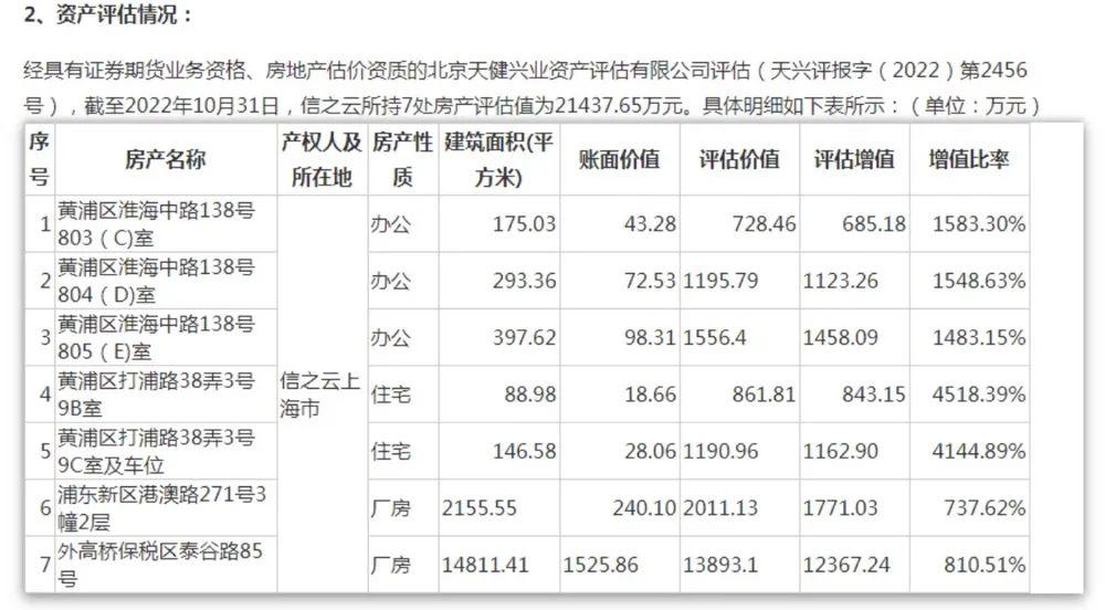 具體來看,這7處房產(chǎn)里有3處為辦公用房,位于黃浦區(qū)淮海中路138號即上海廣場,合計建筑面積約866平方米,合計評估價值達(dá)3480.65萬元,增值比率平均值為1538.36%;2處為廠房,分別位為浦東新區(qū)港澳路271號3幢2層、外高橋(600648)保稅區(qū)泰谷路85號,合計建筑面積約1.7萬平方米,合計評估價值約1.59億元,增值比率平均值為774%。