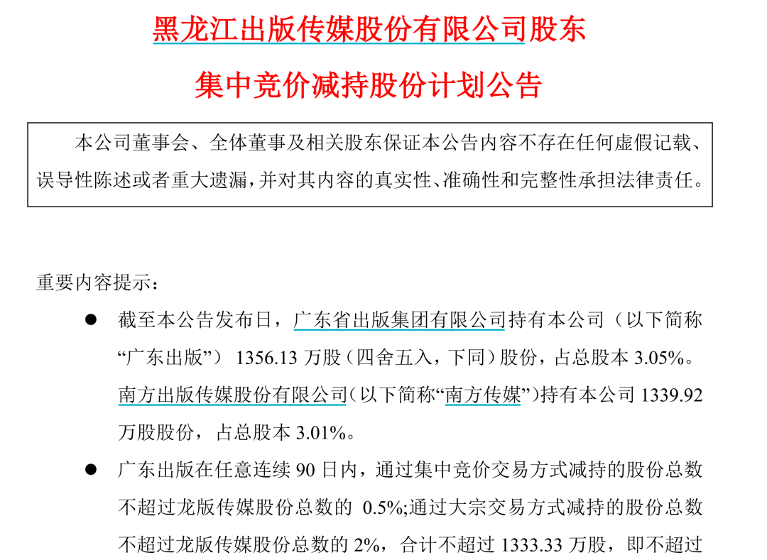 無獨有偶,4月6日,第三大股東廣東省出版集團和第四大股東南方傳媒(601900)紛紛表示,兩家合計減持不超過1778萬股龍版?zhèn)髅健?/p>