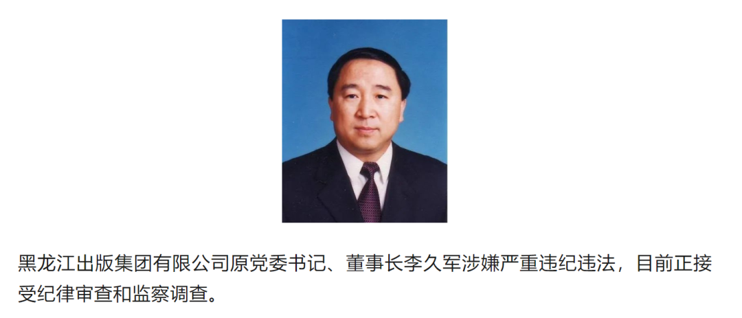 剛剛,據(jù)黑龍江省紀委監(jiān)委消息,黑龍江出版集團有限公司原黨委書記、董事長李久軍涉嫌嚴重違紀違法,目前正接受紀律審查和監(jiān)察調(diào)查。