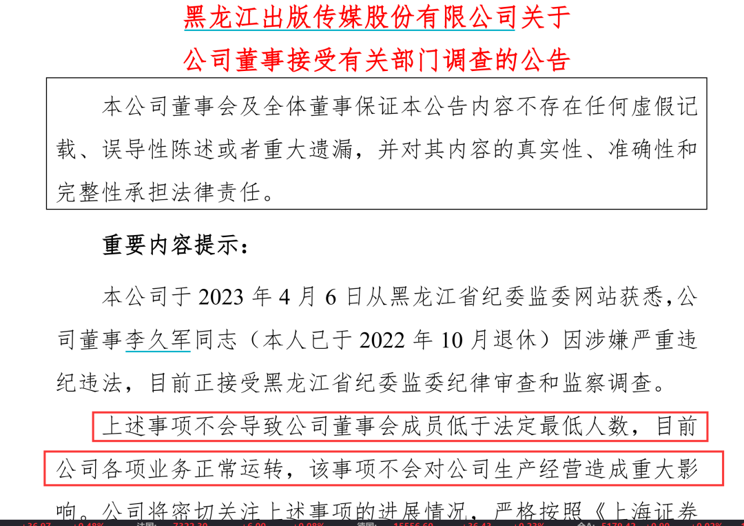 剛剛,龍版?zhèn)髅桨l(fā)布公告表示,上述事項不會導(dǎo)致公司董事會成員低于法定最低人數(shù),目前公司各項業(yè)務(wù)正常運轉(zhuǎn),該事項不會對公司生產(chǎn)經(jīng)營造成重大影響。