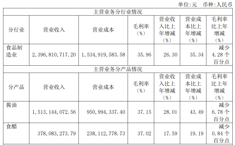 千禾味業(yè)方面表示,2022年,受采購(gòu)成本上升影響,醬油、食醋的毛利率同比均下降。