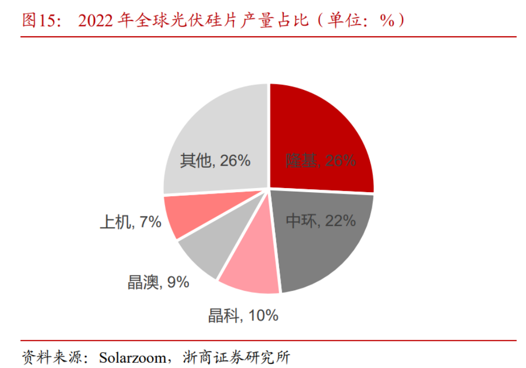 根據(jù)Solarzoom統(tǒng)計數(shù)據(jù)顯示,隆基綠能和TCL中環(huán)2022年硅片產量分別占據(jù)整個市場26%和22%,合計占據(jù)整個市場產能近五成。較其他二線生產企業(yè)有顯著的規(guī)模優(yōu)勢,其余一體化公司或者硅片生產企業(yè)產量占比約為5%-10%。