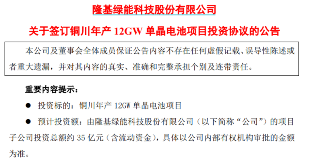 隆基綠能10日披露,其4月8日與銅川市人民政府、銅川新材料產業(yè)園區(qū)管理委員會簽訂單晶電池項目投資合作協(xié)議,擬在陜西省銅川新材料產業(yè)園區(qū)投資建設年產12GW單晶電池項目。項目投資總額約35億元(含流動資金),預計2024年下半年開始投產,2024年底達產。