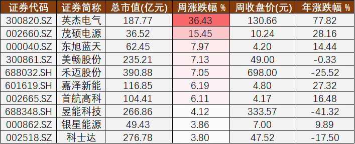 其中,英杰電氣(300820)(300820.SZ)、茂碩電源(002660)(002660.SZ)、東旭藍天(000040)(000040.SZ)在板塊內(nèi)領漲,周漲幅為36.43%、15.45%、7.97%。