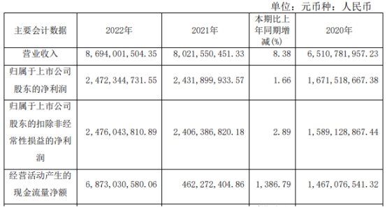 公司董事會擬定2022年度利潤分配預案為:以實施權益分派股權登記日總股本為基數(shù),每10股派發(fā)現(xiàn)金股利12.50元(含稅),共分配現(xiàn)金股利754,146,512.50元(含稅),占合并報表歸屬于公司股東凈利潤的30.50%。本年度公司不送股,不實施公積金轉(zhuǎn)增股本預案。上述預案尚需提交至公司2022年年度股東大會審議通過后實施。