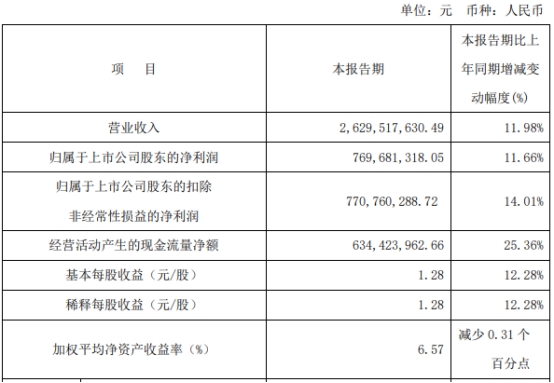 片仔癀同日披露的2023年第一季度報告顯示,公司今年一季度實現(xiàn)營業(yè)收入26.30億元,同比增長11.98%;歸屬于上市公司股東的凈利潤7.70億元,同比增長11.66%;歸屬于上市公司股東的扣除非經(jīng)常性損益的凈利潤7.71億元,同比增長14.01%;經(jīng)營活動產(chǎn)生的現(xiàn)金流量凈額6.34億元,同比增長25.36%;加權平均凈資產(chǎn)收益率6.57%,同比減少0.31個百分點。