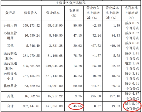 2022年,片仔癀主營業(yè)務毛利率為45.66%,同比減少5.07個百分點。