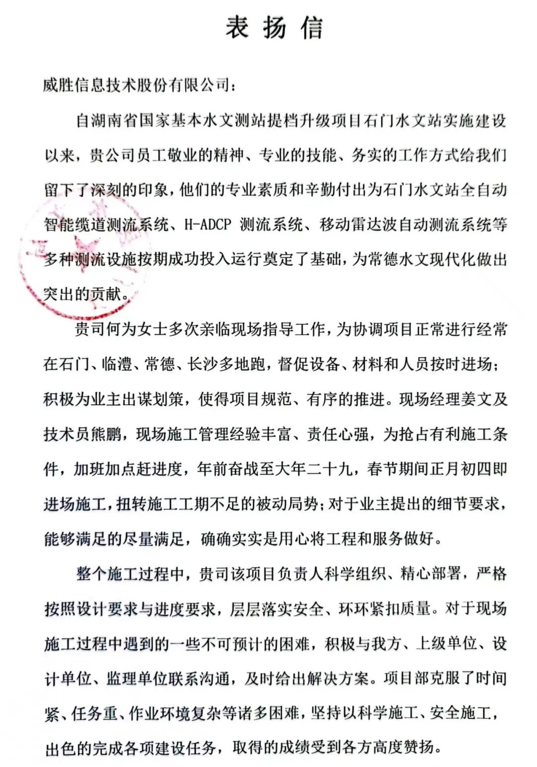 近日,由威勝信息技術(shù)股份有限公司承建的湖南省國家基本水文測站提檔升級項目(常德)迎來首次“大考”,省水文中心黨委委員、副主任顧慶福,站網(wǎng)建設部聶紅勝一行到常德水文中心督導檢查提檔升級項目建設工作,常德水文中心黨委書記、主任李炳輝及相關(guān)部門負責人陪同。在現(xiàn)場,威勝信息的承建工作和全自動水文測流系統(tǒng)得到各方的高度認可和一致好評。