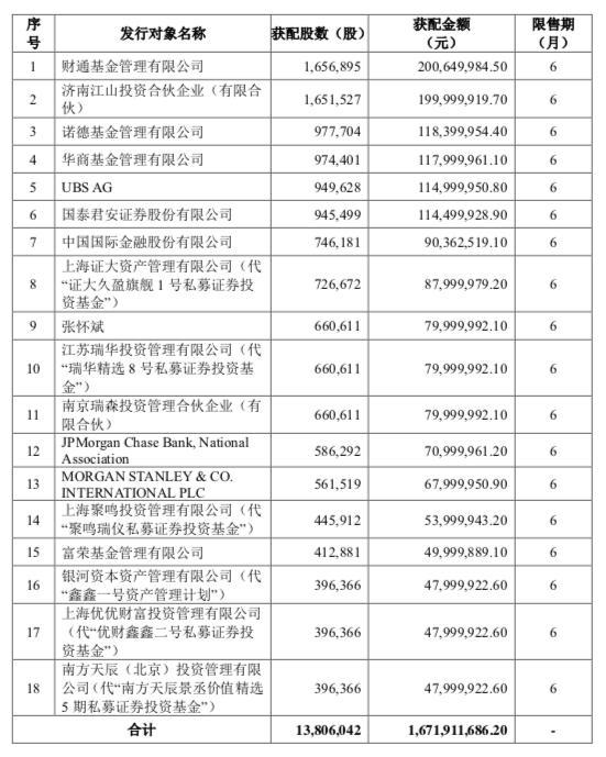 以4月20日266.16元/股的收盤價計算,財通基金、濟南江山投資合伙企業(yè)(有限合伙)、諾德基金、華商基金等18名股東合計的賬面盈余達20.03億元,浮盈達119.79%。