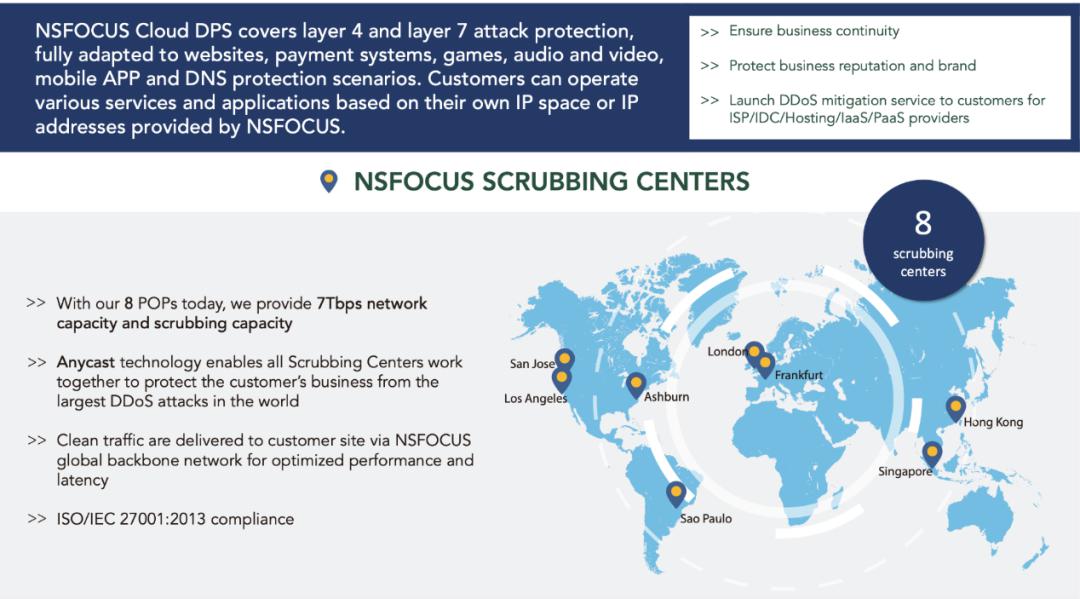 綠盟科技在全球8個(gè)數(shù)據(jù)中心搭建了云清洗平臺(tái),通過(guò)Anycast技術(shù),綠盟科技國(guó)際云清洗服務(wù)可實(shí)現(xiàn)全球節(jié)點(diǎn)聯(lián)合近源清洗。2019年新增巴西圣保羅節(jié)點(diǎn),提供T級(jí)云端DDoS防護(hù)能力。