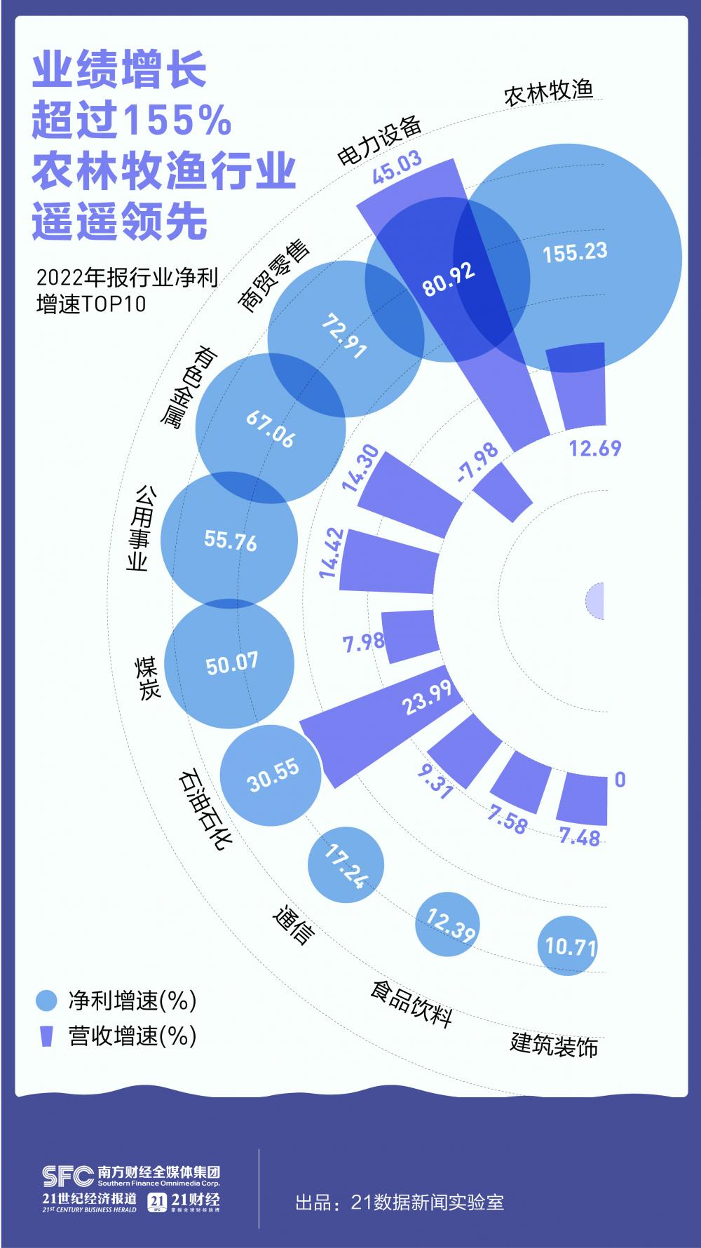 農(nóng)林牧漁是2022年凈利增長最快的行業(yè),也是唯一實現(xiàn)利潤翻倍的行業(yè),增速從2021年的-143%大幅回升至155%,成功“逆襲”。排名第二至第五的行業(yè),凈利增速均超過50%,分別是電力設(shè)備、商貿(mào)零售、有色金屬、公用事業(yè)。
