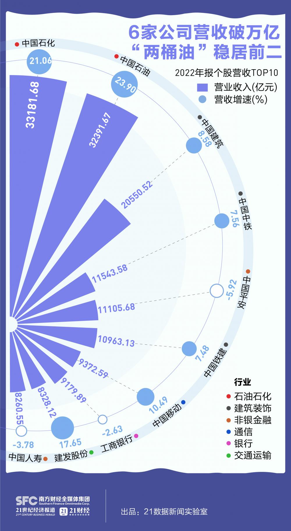 在個股營收TOP10中,“兩桶油”繼續(xù)穩(wěn)居前二,均超過3萬億元。2022年,全球能源危機持續(xù),油氣價格大幅走高,中國石化和中國石油(601857)累計實現(xiàn)歸母凈利潤2157億元,平均每天凈利潤達到5.91億元。其中,中國石油收入、利潤、自由現(xiàn)金流等經(jīng)營業(yè)績均創(chuàng)歷史新高。