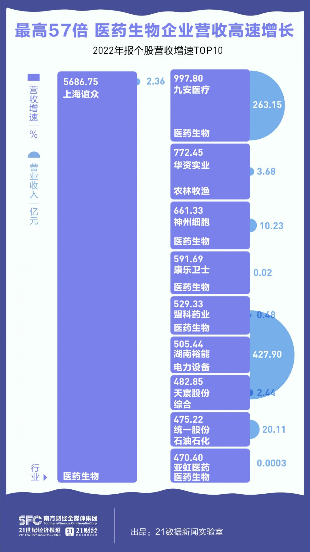 在個股營收增速TOP10中,以上海誼眾為代表的多家醫(yī)藥生物企業(yè)表現(xiàn)亮眼,有55家營收規(guī)模突破百億元,16家營收增速超過100%,板塊整體業(yè)績較為樂觀且好于預(yù)期。