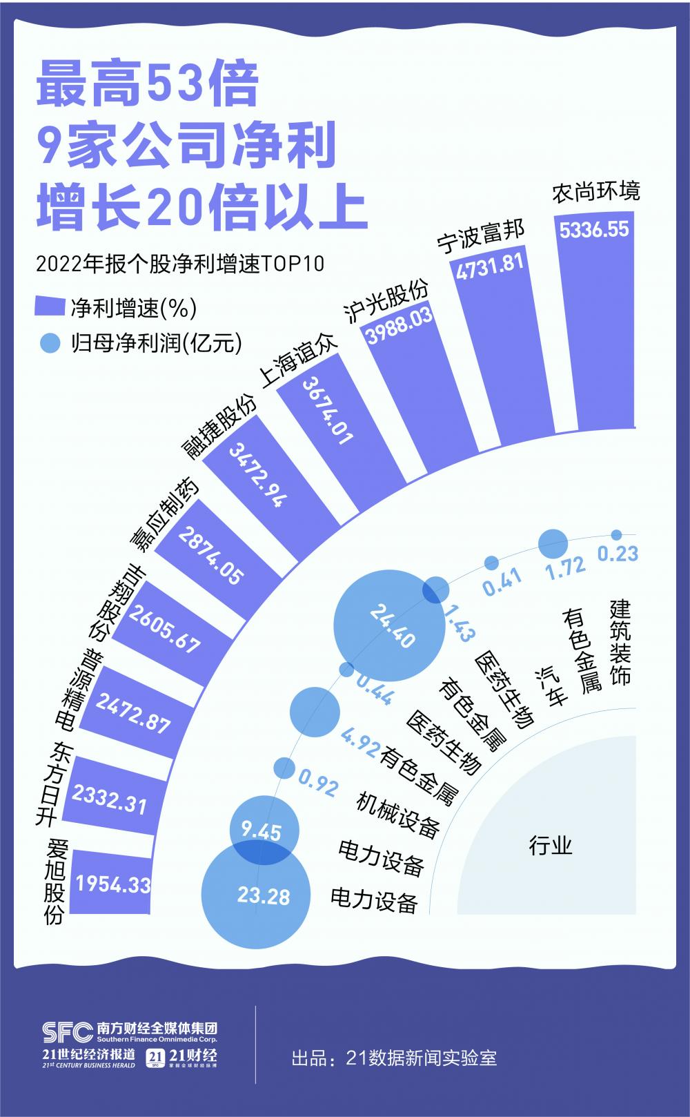 在個股凈利增速TOP10中,前9家公司的增幅均超過20倍。增幅最大的是農(nóng)尚環(huán)境(300536),2022年凈利同比大增53倍,成功扭虧為盈,實現(xiàn)凈利潤2347萬元。