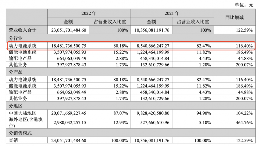 2022年,公司動(dòng)力電池系統(tǒng)收入184.8億元,同比增長(zhǎng)116.4%,占總營(yíng)業(yè)收入比重為80.18%;儲(chǔ)能電池系統(tǒng)收入35.1億元,同比增長(zhǎng)186.49%,占比15.22%;輸配電業(yè)務(wù)收6.64億元,同比增長(zhǎng)44.88%,但占比僅2.88%。