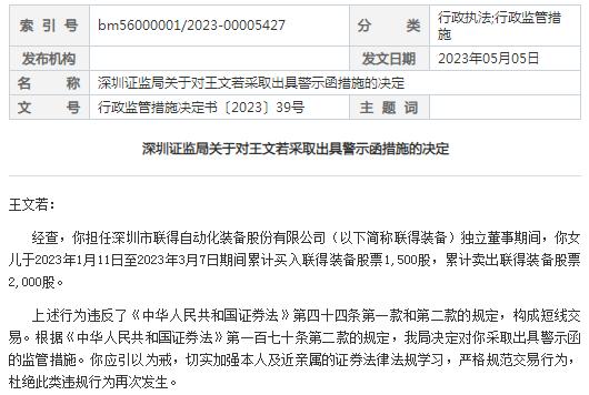 5月5日,深圳證監(jiān)局公告,對聯(lián)得裝備(300545)獨(dú)立董事王文若出具警示函,指出其親屬違規(guī)買賣上市公司股票。