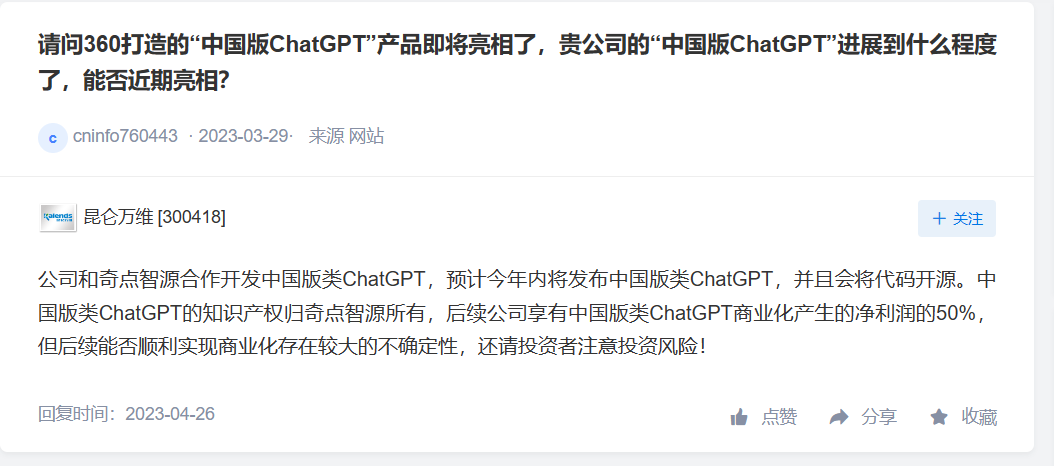 5 月 6 日消息,昆侖萬維(300418)(300418)在投資者互動平臺回復了投資者感興趣的問題。