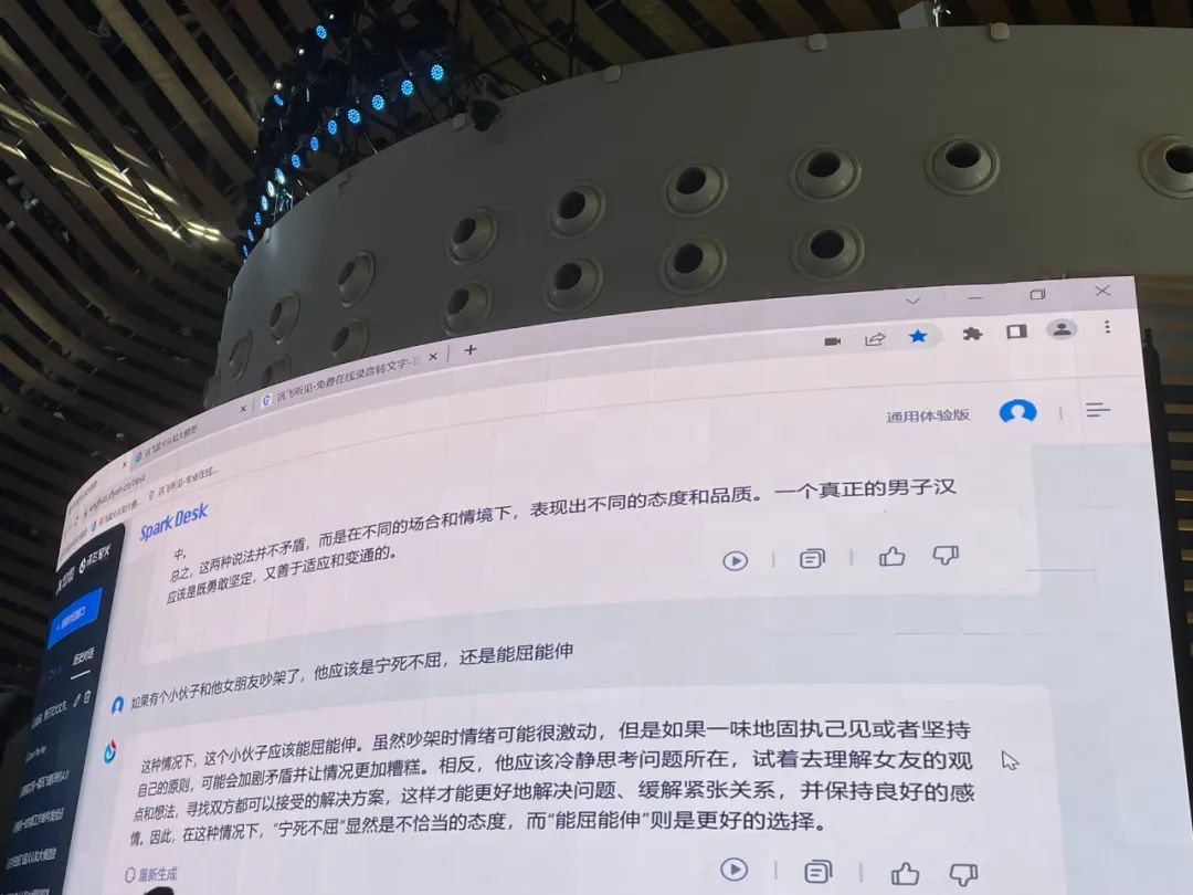 在5月6日的訊飛星火認(rèn)知大模型(簡稱“星火大模型”)成果發(fā)布會上,市場期待已久的科大訊飛(002230)大模型正式亮相,對上述有些刁鉆的問題做出了“高情商”回答:星火大模型不偏不倚地回復(fù)了第一個(gè)問題,第二個(gè)問題卻明顯“站隊(duì)”――小伙子和女朋友吵架,“能屈能伸”是更好的選擇。