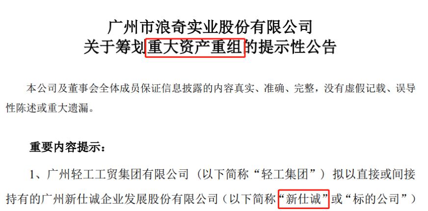 根據(jù)廣州浪奇這份重大資產(chǎn)重組公告,廣州輕工集團擬以直接或間接持有的廣州新仕誠企業(yè)發(fā)展股份有限公司不低于51%的股份與廣州浪奇所持有的廣州浪奇日用品有限公司(“南沙浪奇”)100%股權(quán)、韶關(guān)浪奇有限公司100%股權(quán)、遼寧浪奇實業(yè)有限公司100%股權(quán)、廣州市日用化學(xué)工業(yè)研究所有限公司60%股權(quán)等值部分進行資產(chǎn)置換。擬置出資產(chǎn)交易價格超過擬置入資產(chǎn)交易價格的置換差額以現(xiàn)金補足(如有)。