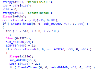 8、接著獲取CreateThread函數(shù)地址,創(chuàng)建3個線程與服務器通信,上傳主機信息接收遠控指令。