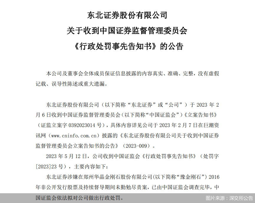 7年舊案被翻出,東北證券難逃其咎。5月14日,東北證券發(fā)布公告表示,5月12日,公司收到中國(guó)證監(jiān)會(huì)《行政處罰事先告知書(shū)》,指出東北證券涉嫌在豫金剛石2016年非公開(kāi)發(fā)行股票及持續(xù)督導(dǎo)期間未勤勉盡責(zé)案,證監(jiān)會(huì)依法擬對(duì)東北證券做出行政處罰。