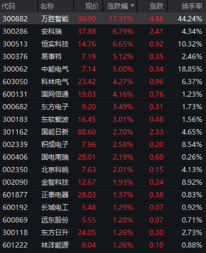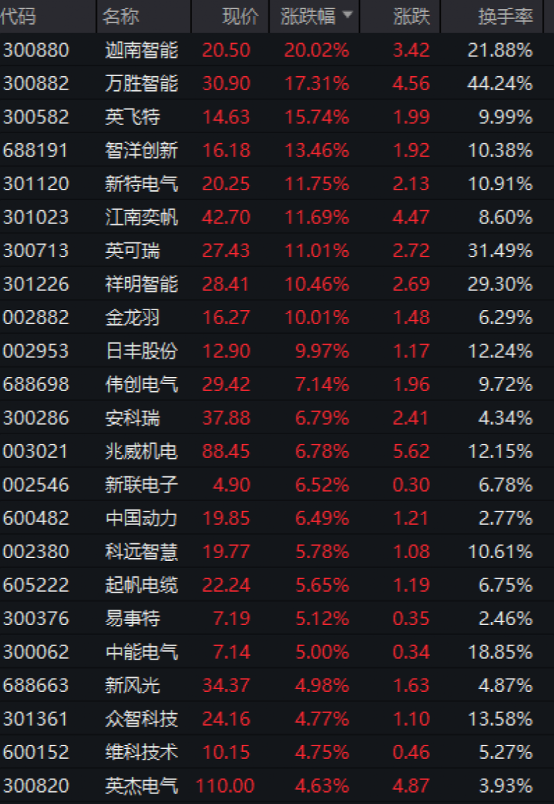 電工電網(wǎng)板塊繼續(xù)活躍,迦南智能(300880)20CM漲停,萬勝只能、英飛特(300582)、智洋創(chuàng)新等大漲。