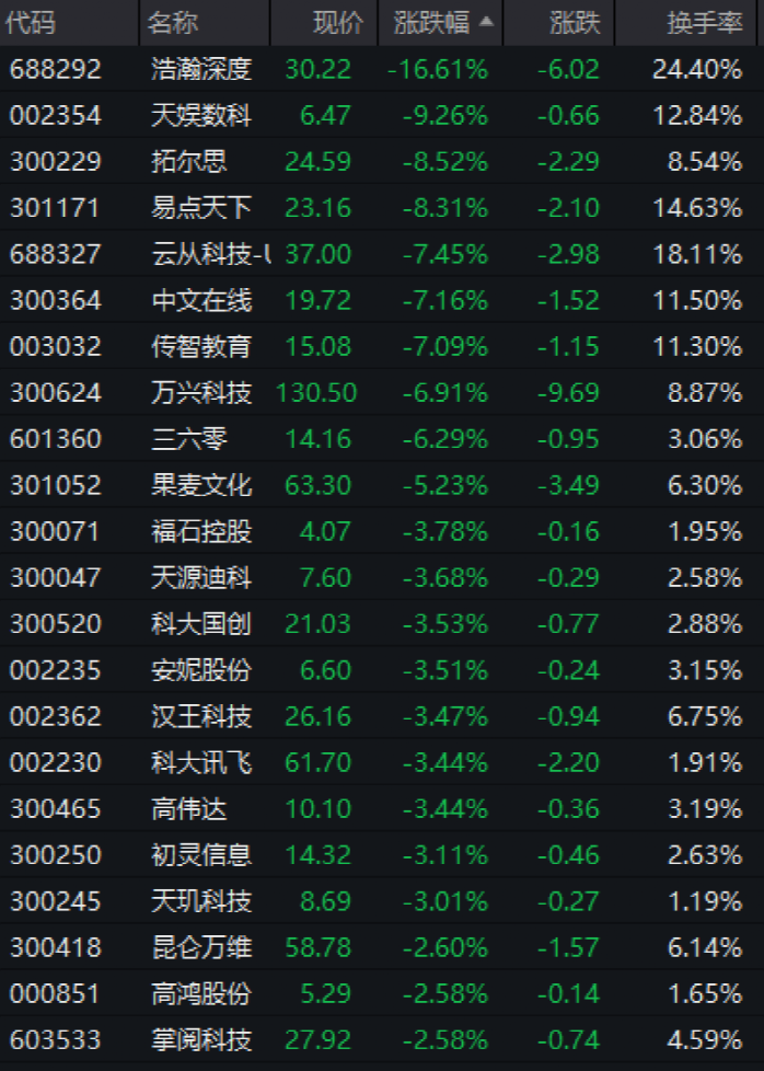 人工智能板塊持續(xù)走弱,AIGC、ChatGPT方向領(lǐng)跌,浩瀚深度盤中20CM跌停,天娛數(shù)科(002354)逼近跌停,拓爾思(300229)、云從科技、中文在線(300364)等熱門股跌超5%。