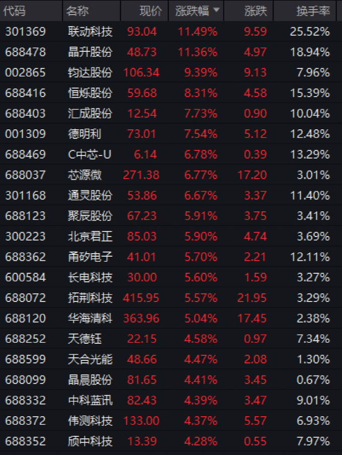 此外,芯片、半導(dǎo)體板塊震蕩反彈,存儲(chǔ)芯片方向領(lǐng)漲。聯(lián)動(dòng)科技(301369)、晶升股份漲超11%,鈞達(dá)股份(002865)、匯成股份等均漲超7%。