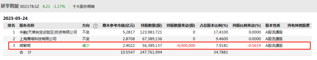 數(shù)據(jù)顯示,截至5月24日,該公司第一大股東為華融(天津自貿(mào)試驗區(qū))投資有限公司,持股比例17.41%;胡黎明持股數(shù)量減少了400萬股,不過仍以7.92%的持股比例位列公司第三大股東。