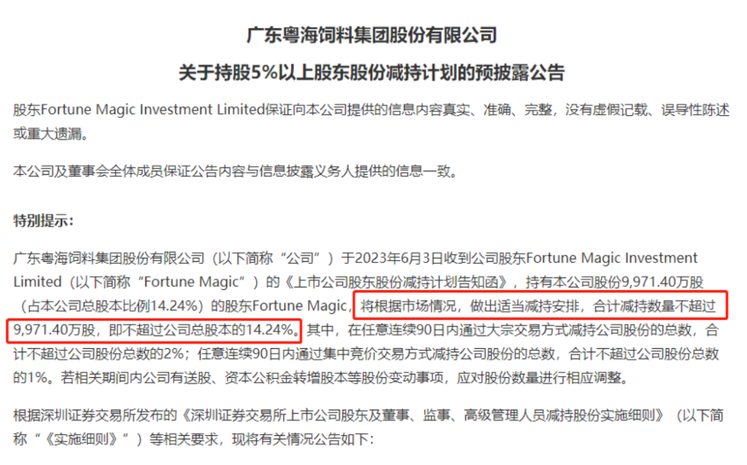 6月4日晚間,A股公司粵海飼料(001313)公告,持股14.24%的股東Fortune Magic Investment Limited,擬減持公司不超過9971.4萬股,即不超過公司總股本的14.24%,也就是準(zhǔn)備將持倉的所有股票進(jìn)行減持了。