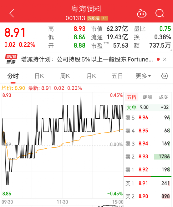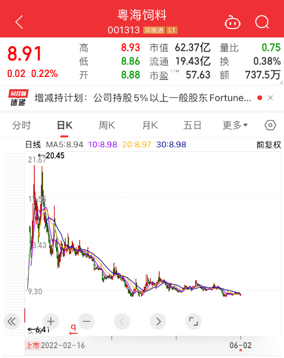 Fortune Magic Investment Limited持有的股份今年2月剛剛解禁,按照粵海飼料最新收盤價8.91元計(jì)算,擬減倉市值8.88億元,接近9億元。