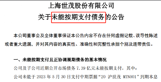 6月2日晚公司公告,公司及子公司近期公開(kāi)市場(chǎng)債務(wù)7.39億元未能按期支付,其中:公司未能于2023年5月30日支付中期票據(jù)“20滬世茂MTN001”到期本息2540萬(wàn)元、“21滬世茂MTN001”到期利息833萬(wàn)元、“21滬世茂MTN002”到期利息586萬(wàn)元;子公司未能于2023年4月10日支付資產(chǎn)支持專(zhuān)項(xiàng)計(jì)劃“希爾頓01”的資產(chǎn)支持證券退出款7億元。