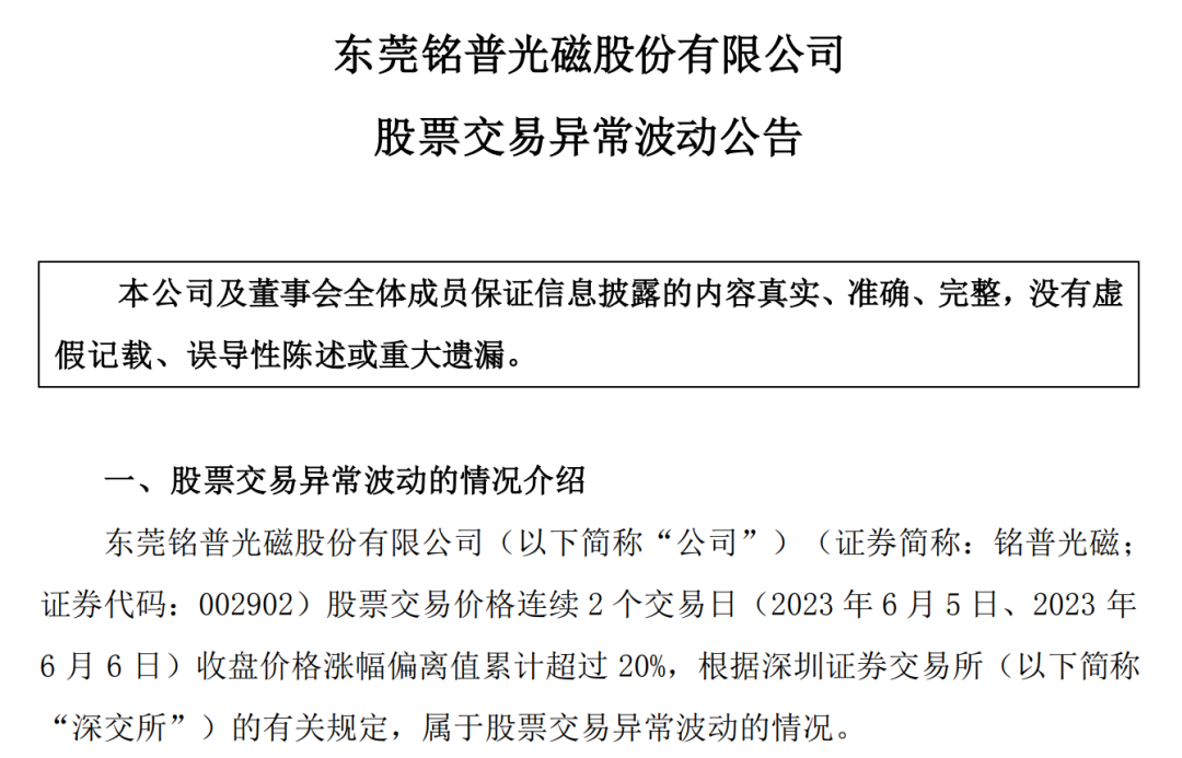 6月6日晚,銘普光磁曾發(fā)布股票交易異常波動公告稱,公司未發(fā)現(xiàn)近期公共傳媒報道了可能或已經(jīng)對公司股票交易價格產(chǎn)生較大影響的未公開重大信息;公司已披露的經(jīng)營情況、內(nèi)外部經(jīng)營環(huán)境未發(fā)生重大變化;公司、控股股東和實際控制人不存在關(guān)于公司的應(yīng)披露而未披露的重大事項。