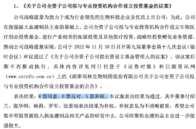 3月17日,派林生物董事會(huì)審議子公司擬與專業(yè)投資機(jī)構(gòu)合作設(shè)立生物醫(yī)療創(chuàng)業(yè)投資基金的議案,包括付紹蘭在內(nèi)的5名董事投出棄權(quán)票。棄權(quán)意見為希望公司集中有限資源投入血液制品相關(guān)產(chǎn)品研發(fā),聚焦血液制品主業(yè)做強(qiáng)做大。