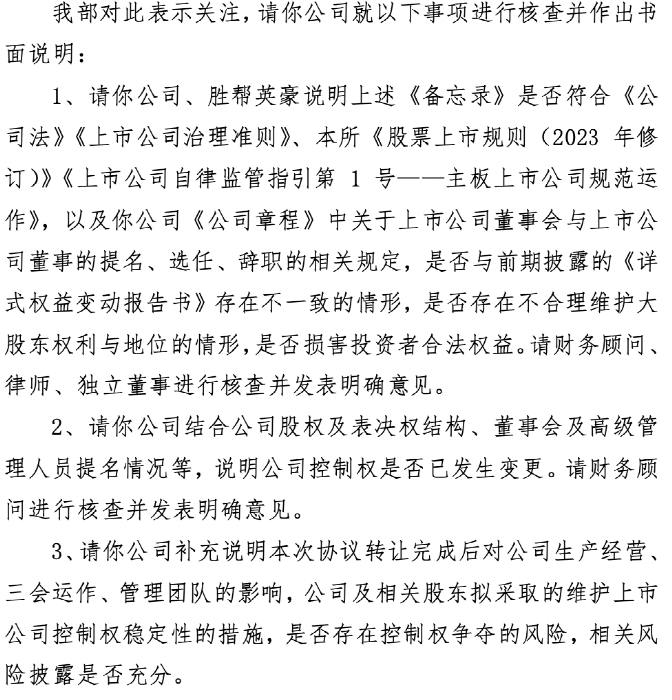 深交所要求公司、勝幫英豪說明,《備忘錄》是否符合《公司法》《上市公司治理準(zhǔn)則》、本所《股票上市規(guī)則(2023年修訂)》《上市公司自律監(jiān)管指引第1號(hào)——主板上市公司規(guī)范運(yùn) 作》。以及公司《公司章程》中關(guān)于上市公司董事會(huì)與上市公司董事的提名、選任、辭職的相關(guān)規(guī)定,是否與前期披露的《詳式權(quán)益變動(dòng)報(bào)告書》存在不一致的情形。