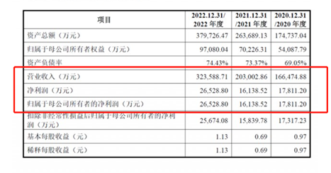 明陽電氣《招股說明書》顯示,明陽電氣2020年、2021年、2022年?duì)I收分別為16.65億元、20.3億元、32.36億元;凈利分別為1.78億元、1.61億元、2.65億元;扣非后凈利分別為1.73億元、1.58億元、2.57億元。