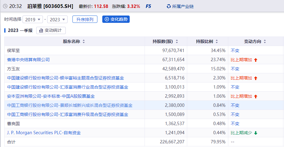 具體來(lái)看,方玉友此次被司法凍結(jié)的股數(shù)近1704.13萬(wàn)股,占方玉友所持有珀萊雅股份數(shù)的28.5806%,占目前珀萊雅總股本的4.2933%;凍結(jié)起始日為2023年5月26日,凍結(jié)申請(qǐng)人為溫州市中級(jí)人民法院。按珀萊雅目前最新股價(jià)112.58元/股計(jì)算,被凍結(jié)股份市場(chǎng)價(jià)值或達(dá)19.18億元。