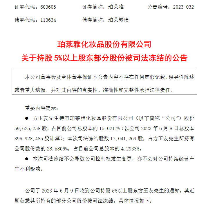 6月12日盤后,珀萊雅(603605)(603605.SH)公告,于6月9日收到公司持股5%以上股東方玉友的通知,其近期獲悉其所持有的部分公司股份被司法凍結(jié)。