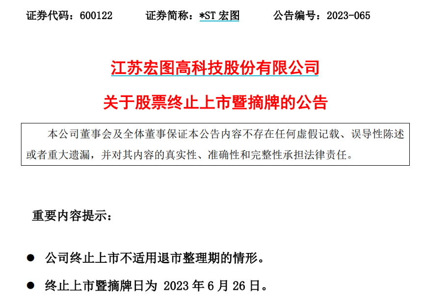 *ST宏圖公告稱,2023年4月26日至5月26日,*ST宏圖連續(xù)20個交易日的每日收盤價均低于1元,上述情形觸及終止上市,上交所決定終止公司股票上市,將在6月26日對公司股票予以摘牌。