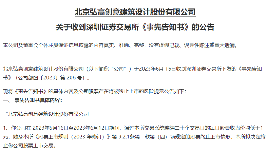 *ST弘高公告稱,公司股票在2023年5月16日至2023年6月12日期間,通過深圳證券交易所交易系統(tǒng)連續(xù)20個交易日的每日股票收盤價均低于1元,深圳證券交易所擬決定終止公司股票上市交易。