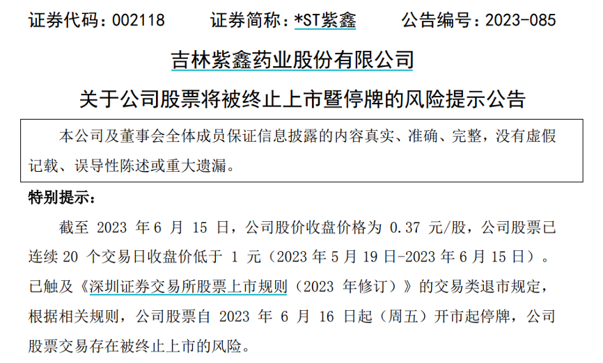 *ST紫鑫公告,截至2023 年6月15日,公司股價收盤價格為0.37元/股,公司股票已連續(xù)20個交易日收盤價低于1元(2023年5月19日-2023年6月15日)。已觸及交易類退市規(guī)定,根據(jù)相關(guān)規(guī)則,公司股票自2023年6月16日起(周五)開市起停牌,公司股票交易存在被終止上市的風險。公司股票不進入退市整理期。