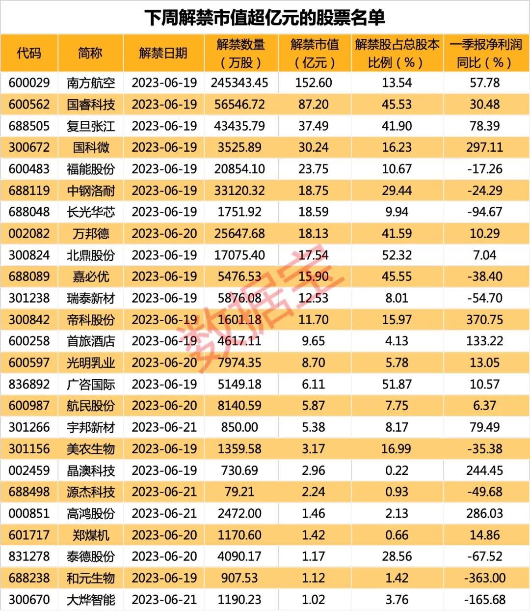國??萍嫉慕饨?guī)模次之,下周將有5.65億股上市流通,解禁股主要為定向增發(fā)機構(gòu)配售股份,解禁市值達87.2億元。