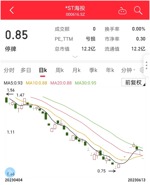 然而,上述增持計(jì)劃的完成并未阻擋股價(jià)頹勢(shì)。截至6月13日,*ST海投收?qǐng)?bào)0.85元,收盤(pán)價(jià)連續(xù)二十個(gè)交易日低于1元/股,正式鎖定“1元退市”。